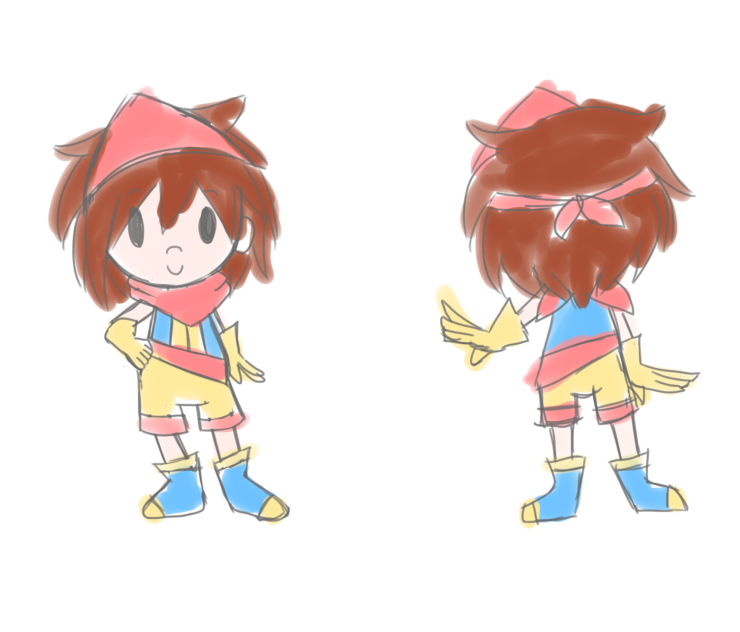 The character design for the protagonist of a student project game. The basic idea was a combination of a “typical” JRPG protagonist and the main character of Earthbound.